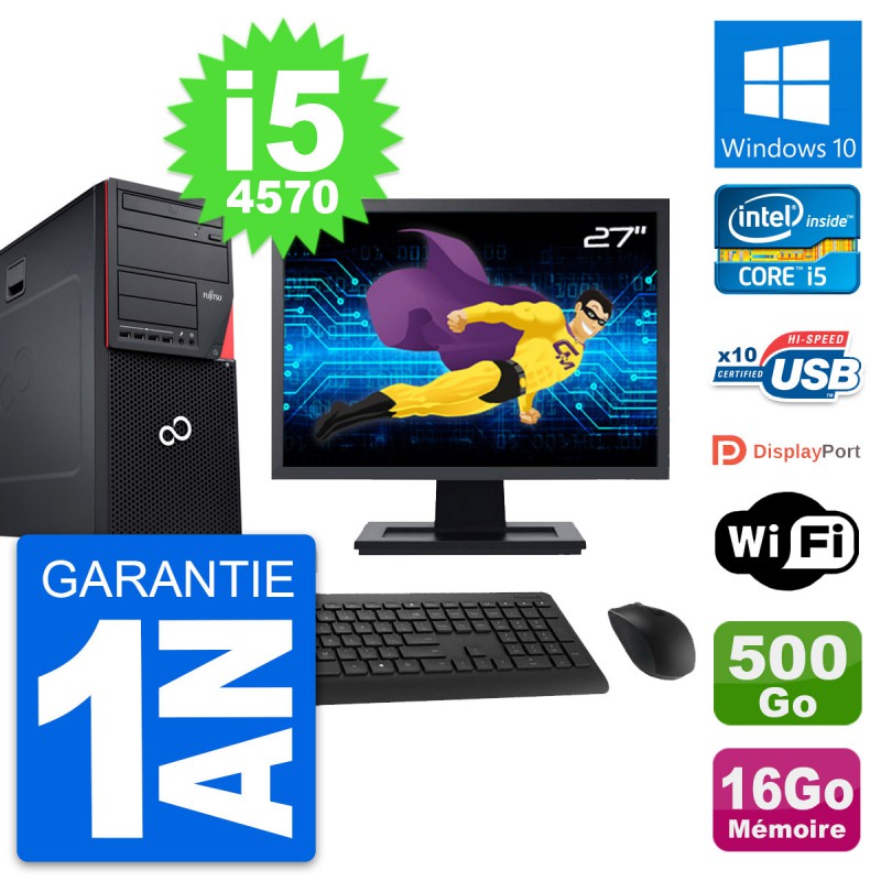PC Tour Fujitsu Esprimo P720 - Intel Core i5-4570 3.2 Ghz (6 Mo) - 16 Go DDR3 - Disque Dur 3,5" 500 Go - Graveur DVD - Clef Wifi USB - Windows 10 - Livré avec Ecran 27" + clavier + souris (Marques et modèles variables) - Garantie 1 an.