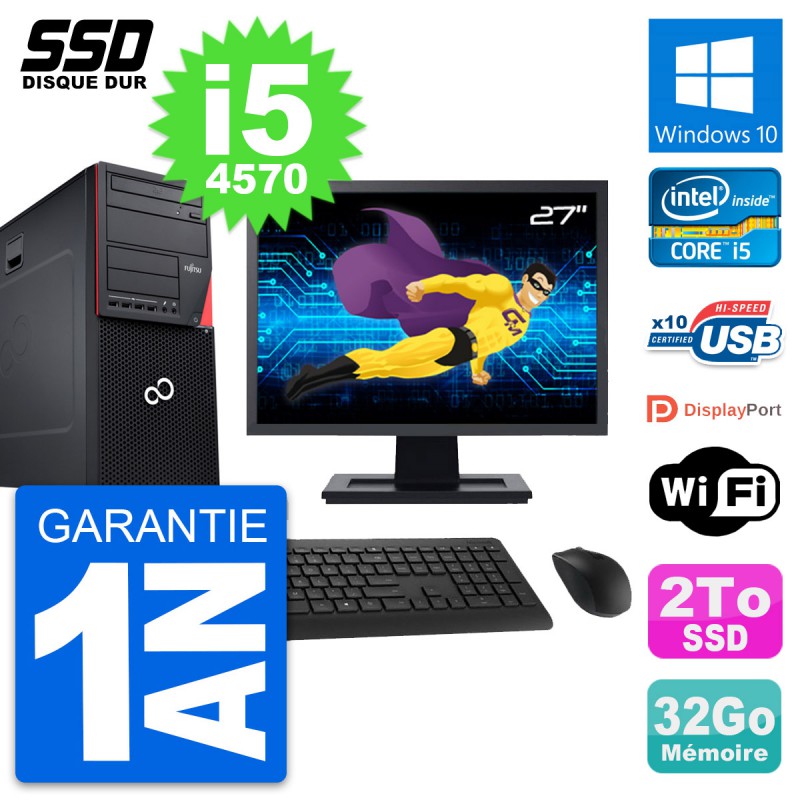 PC Tour Fujitsu Esprimo P720 - Intel Core i5-4570 3.2 Ghz (6 Mo) - 32 Go DDR3 - SSD 2 To - Graveur DVD - Clef Wifi USB - Windows 10 - Livré avec Ecran 27" + clavier + souris (Marques et modèles variables) - Garantie 1 an.