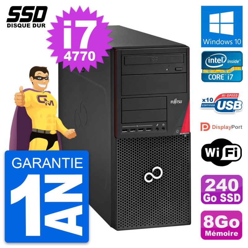PC Tour Fujitsu Esprimo P720 - Intel Core i7-4770 3.4 Ghz (8 Mo) - 8 Go DDR3 - SSD 240 Go - Graveur DVD - Clef Wifi USB - Windows 10 - Garantie 1 an.
