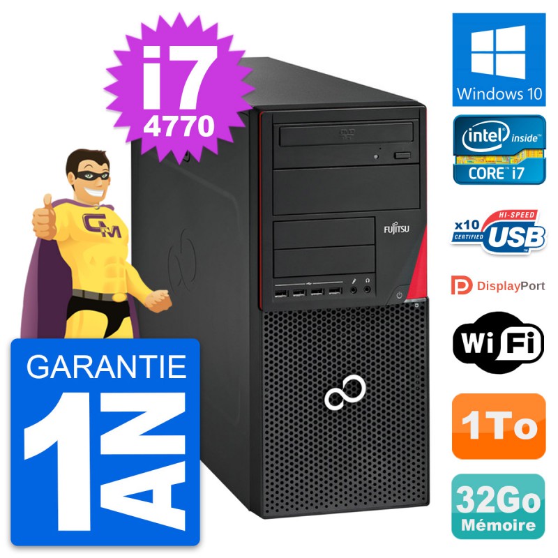 PC Tour Fujitsu Esprimo P720 - Intel Core i7-4770 3.4 Ghz (8 Mo) - 32 Go DDR3 - Disque Dur 3,5" 1 To - Graveur DVD - Clef Wifi USB - Windows 10 - Garantie 1 an.