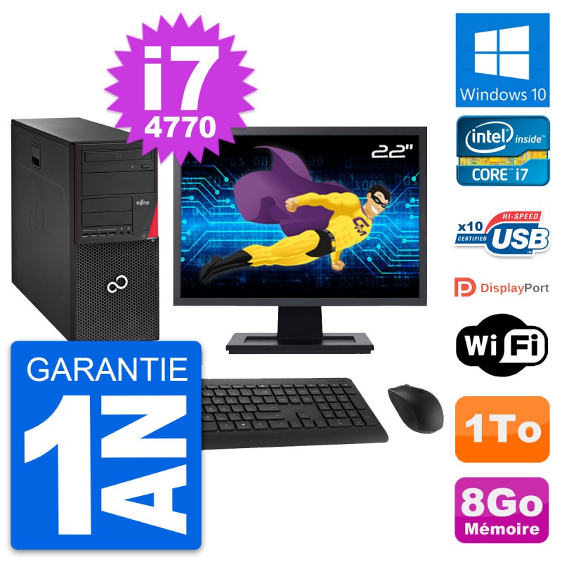 PC Tour Fujitsu Esprimo P720 - Intel Core i7-4770 3.4 Ghz (8 Mo) - 8 Go DDR3 - Disque Dur 3,5" 1 To - Graveur DVD - Clef Wifi USB - Windows 10 - Livré avec Ecran 22" + clavier + souris (Marques et modèles variables) - Garantie 1 an.