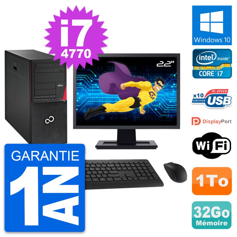 PC Tour Fujitsu Esprimo P720 - Intel Core i7-4770 3.4 Ghz (8 Mo) - 32 Go DDR3 - Disque Dur 3,5" 1 To - Graveur DVD - Clef Wifi USB - Windows 10 - Livré avec Ecran 22" + clavier + souris (Marques et modèles variables) - Garantie 1 an.