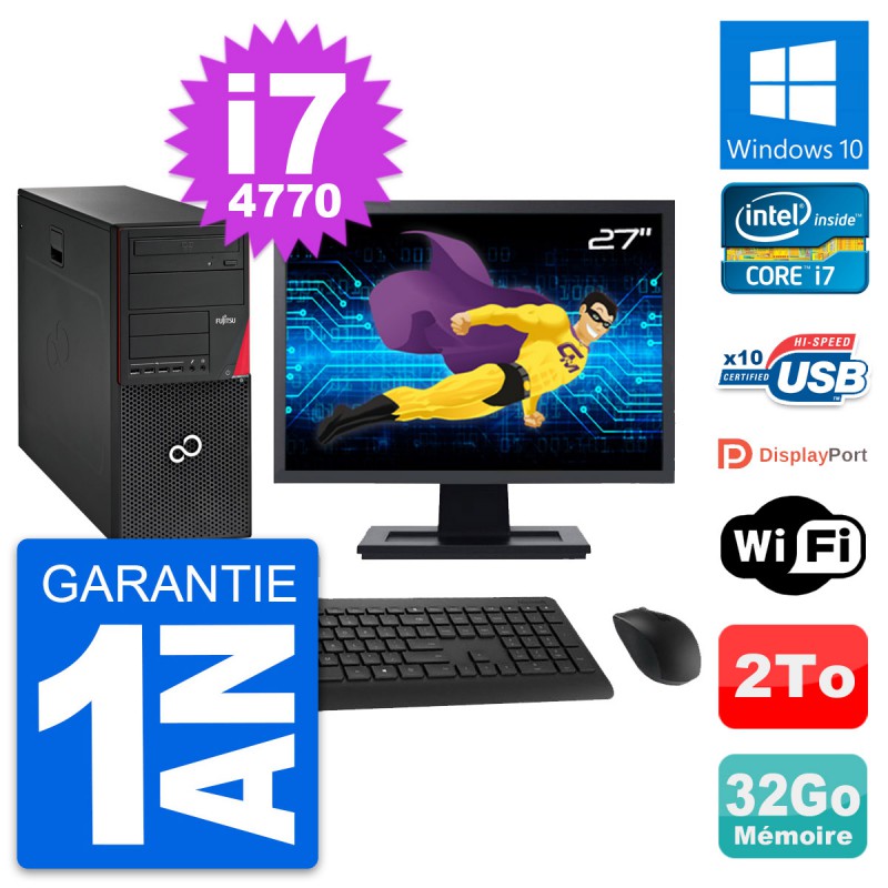 PC Tour Fujitsu Esprimo P720 - Intel Core i7-4770 3.4 Ghz (8 Mo) - 32 Go DDR3 - Disque Dur 3,5" 2 To - Graveur DVD - Clef Wifi USB - Windows 10 - Livré avec Ecran 27" + clavier + souris (Marques et modèles variables) - Garantie 1 an.