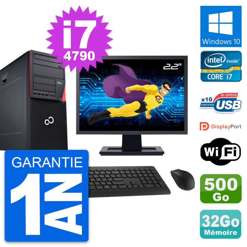 PC Tour Fujitsu Esprimo P720 - Intel Core i7-4790 3.6 Ghz (8 Mo) - 32 Go DDR3 - Disque Dur 3,5" 500 Go - Graveur DVD - Clef Wifi USB - Windows 10 - Livré avec Ecran 22" + clavier + souris (Marques et modèles variables) - Garantie 1 an.