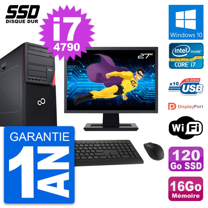 PC Tour Fujitsu Esprimo P720 - Intel Core i7-4790 3.6 Ghz (8 Mo) - 16 Go DDR3 - SSD 120 Go - Graveur DVD - Clef Wifi USB - Windows 10 - Livré avec Ecran 27" + clavier + souris (Marques et modèles variables) - Garantie 1 an.