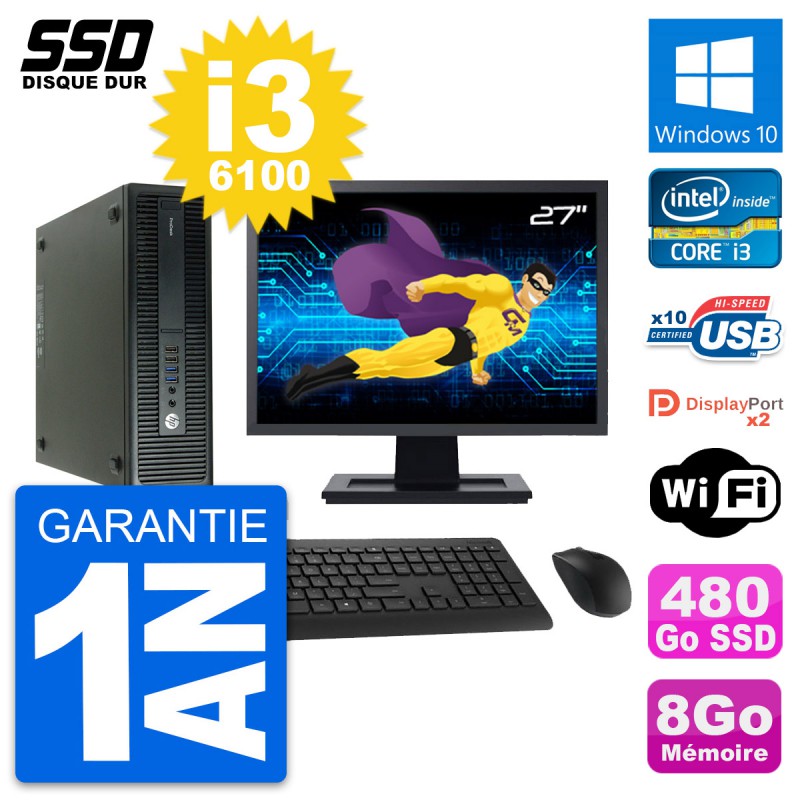 PC HP ProDesk 600 G2 SFF - Intel Core i3-6100 3.7 Ghz (3 Mo) - 8 Go DDR4 - SSD 480 Go - Clef Wifi USB - Windows 10 - Livré avec Ecran 27" + clavier + souris (Marques et modèles variables) - Garantie 1 an.