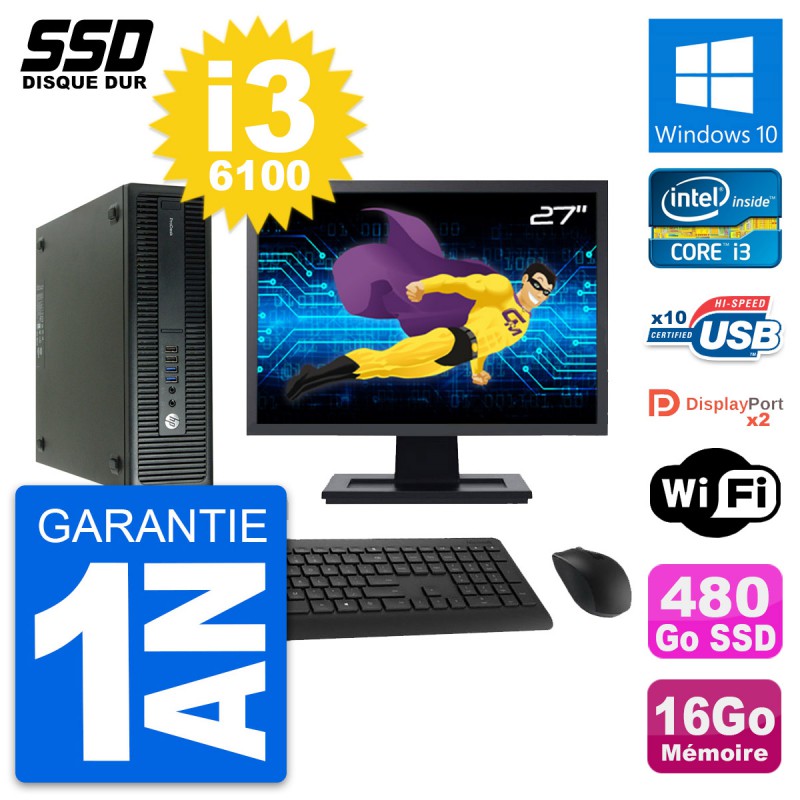 PC HP ProDesk 600 G2 SFF - Intel Core i3-6100 3.7 Ghz (3 Mo) - 16 Go DDR4 - SSD 480 Go - Clef Wifi USB - Windows 10 - Livré avec Ecran 27" + clavier + souris (Marques et modèles variables) - Garantie 1 an.
