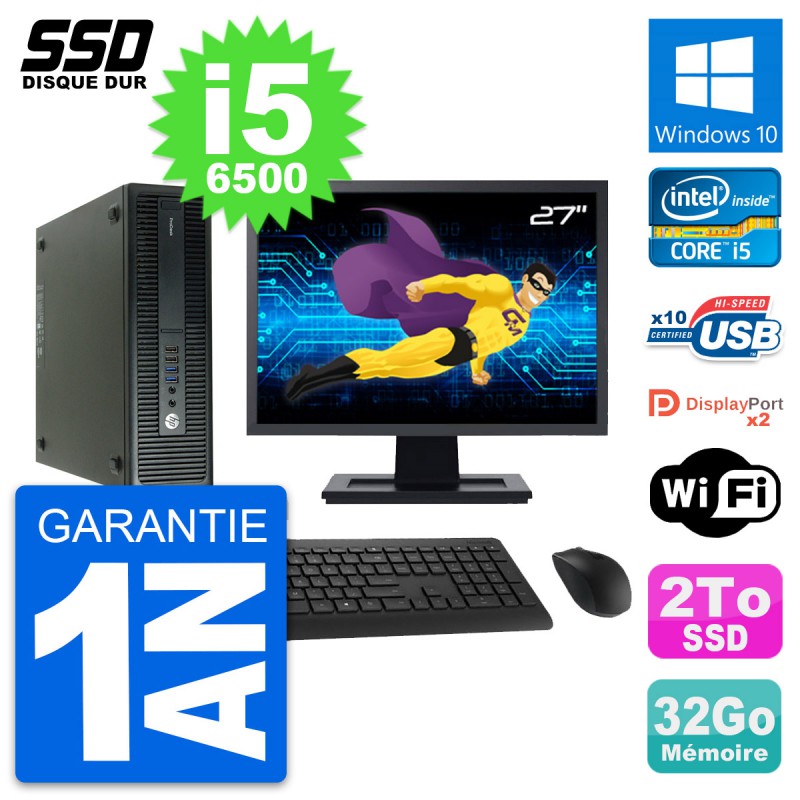 PC HP ProDesk 600 G2 SFF - Intel Core i5-6500 3.2 Ghz (6 Mo) - 32 Go DDR4 - SSD 2 To - Clef Wifi USB - Windows 10 - Livré avec Ecran 27" + clavier + souris (Marques et modèles variables) - Garantie 1 an.