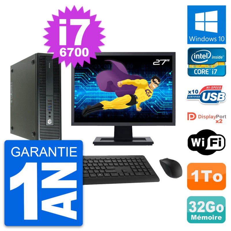 PC HP ProDesk 600 G2 SFF - Intel Core i7-6700 3.4 Ghz (8 Mo) - 32 Go DDR4 - Disque Dur 3,5" 1 To - Clef Wifi USB - Windows 10 - Livré avec Ecran 27" + clavier + souris (Marques et modèles variables) - Garantie 1 an.