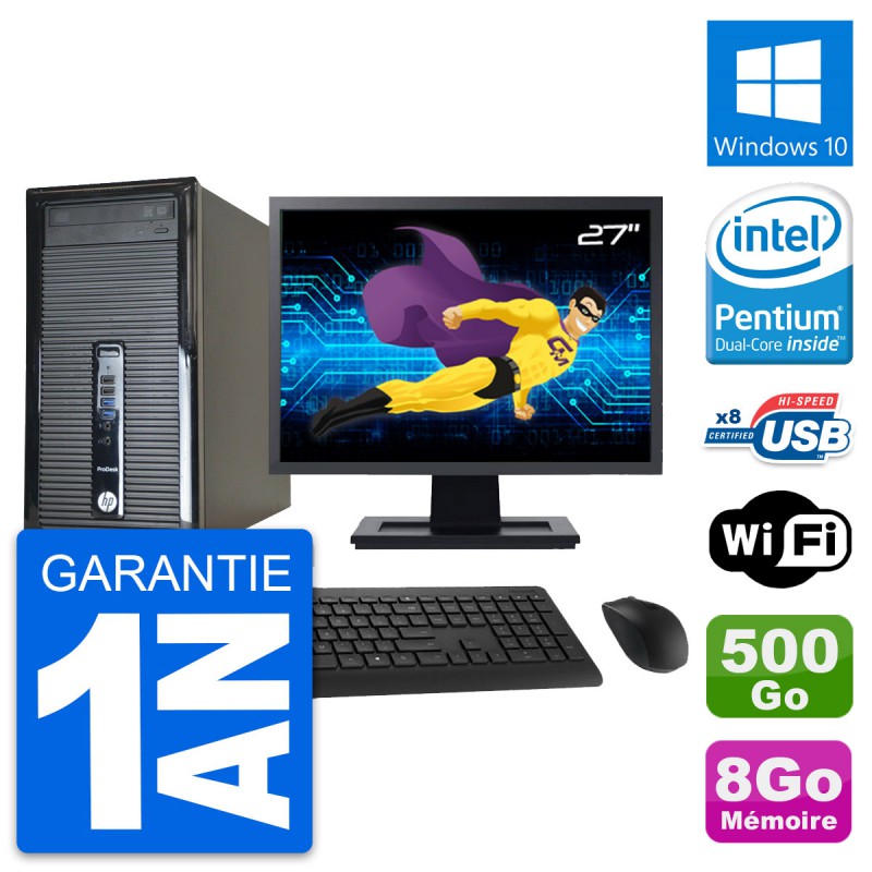 PC Tour HP ProDesk 400 G1 MT - Intel Pentium Dual-Core G3220 3.0 Ghz (3 Mo) - 8 Go DDR3 - Disque Dur 3,5" 500 Go - Clef Wifi USB - Graveur DVD - Windows 10 - Livré avec Ecran 27" + clavier + souris (Marques et modèles variables) - Garantie 1 an.