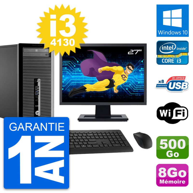 PC Tour HP ProDesk 400 G1 MT - Intel Core i3-4130 3.4 Ghz (3 Mo) - 8 Go DDR3 - Disque Dur 3,5" 500 Go - Clef Wifi USB - Graveur DVD - Windows 10 - Livré avec Ecran 27" + clavier + souris (Marques et modèles variables) - Garantie 1 an.