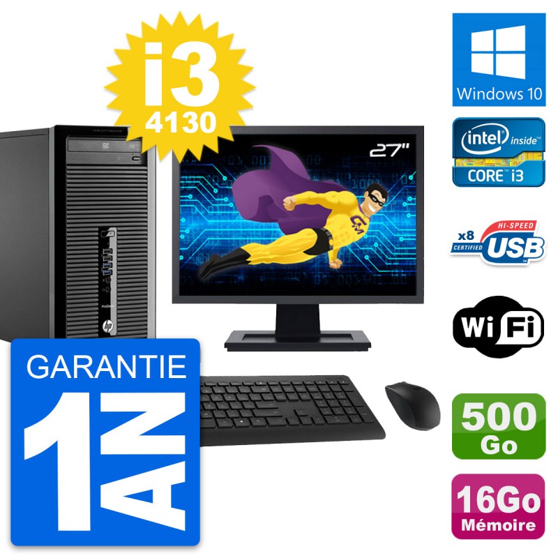 PC Tour HP ProDesk 400 G1 MT - Intel Core i3-4130 3.4 Ghz (3 Mo) - 16 Go DDR3 - Disque Dur 3,5" 500 Go - Clef Wifi USB - Graveur DVD - Windows 10 - Livré avec Ecran 27" + clavier + souris (Marques et modèles variables) - Garantie 1 an.