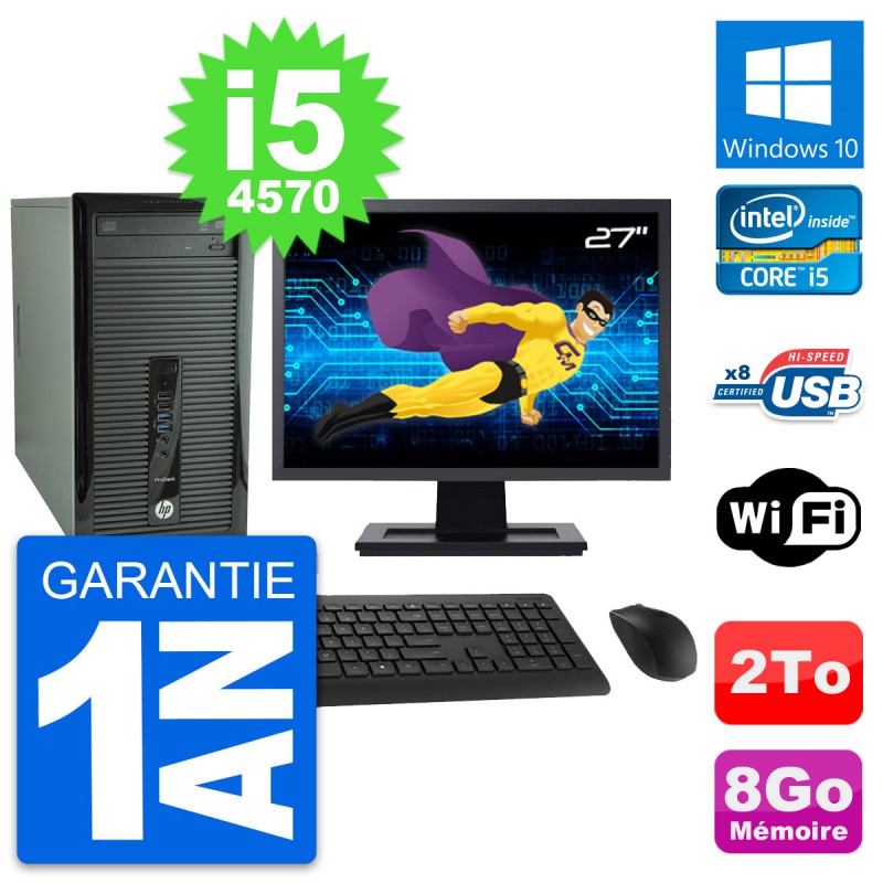PC Tour HP ProDesk 400 G1 MT - Intel Core i5-4570 3.2 Ghz (6 Mo) - 8 Go DDR3 - Disque Dur 3,5" 2 To - Clef Wifi USB - Graveur DVD - Windows 10 - Livré avec Ecran 27" + clavier + souris (Marques et modèles variables) - Garantie 1 an.