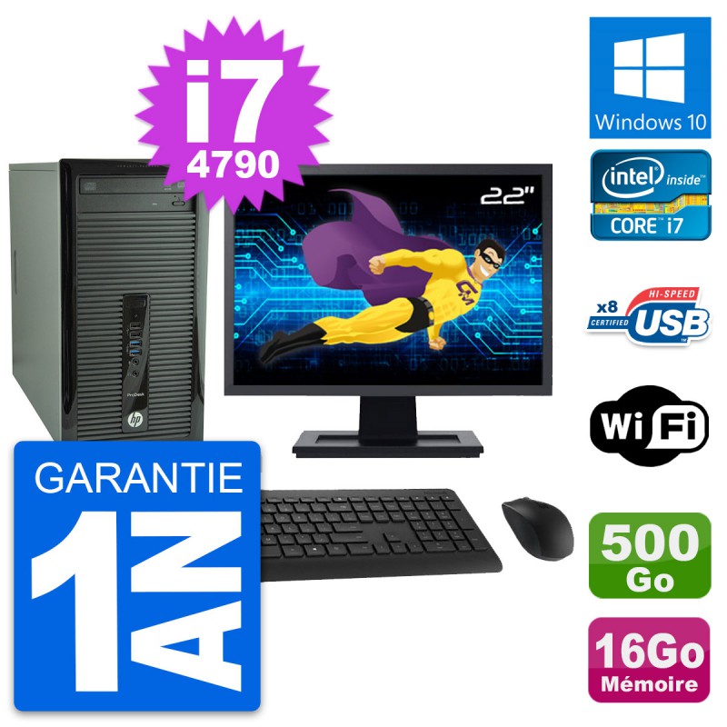PC Tour HP ProDesk 400 G1 MT - Intel Core i7-4790 3.6 Ghz (8 Mo) - 16 Go DDR3 - Disque Dur 3,5" 500 Go - Clef Wifi USB - Graveur DVD - Windows 10 - Livré avec Ecran 22" + clavier + souris (Marques et modèles variables) - Garantie 1 an.