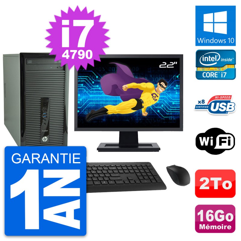 PC Tour HP ProDesk 400 G1 MT - Intel Core i7-4790 3.6 Ghz (8 Mo) - 16 Go DDR3 - Disque Dur 3,5" 2 To - Clef Wifi USB - Graveur DVD - Windows 10 - Livré avec Ecran 22" + clavier + souris (Marques et modèles variables) - Garantie 1 an.