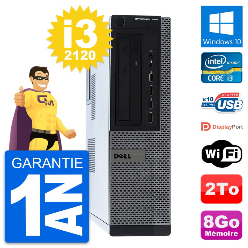 PC Dell OptiPlex 990 DT - Intel Core i3-2120 3.3 Ghz (3 Mo) - 8 Go DDR3 - Disque Dur 3,5" 2 To - Graveur DVD - Clef Wifi USB - Windows 10 - Garantie 1 an.