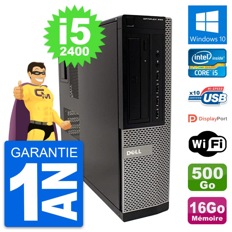 PC Dell OptiPlex 990 DT - Intel Core i5-2400 3.1 Ghz (6 Mo) - 16 Go DDR3 - Disque Dur 3,5" 500 Go - Graveur DVD - Clef Wifi USB - Windows 10 - Garantie 1 an.