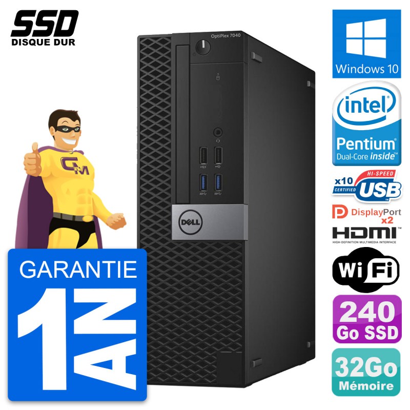 PC Dell OptiPlex 7040 SFF - Intel Pentium Dual-Core G4400 3.3 Ghz (3 Mo) - 32 Go DDR4 - SSD 240 Go - Clef Wifi USB - Windows 10 - Garantie 1 an.