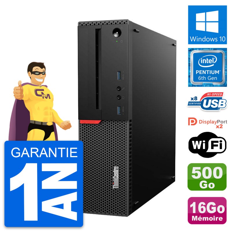 PC Lenovo ThinkCentre M800 SFF - Intel Pentium Dual-Core G4400 3.3 Ghz (3 Mo) - 16 Go DDR4 - Disque Dur 3,5" 500 Go - Clef Wifi USB - Windows 10 - Garantie 1 an.