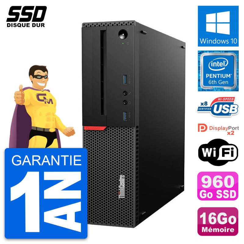 PC Lenovo ThinkCentre M800 SFF - Intel Pentium Dual-Core G4400 3.3 Ghz (3 Mo) - 16 Go DDR4 - SSD 960 Go - Clef Wifi USB - Windows 10 - Garantie 1 an.