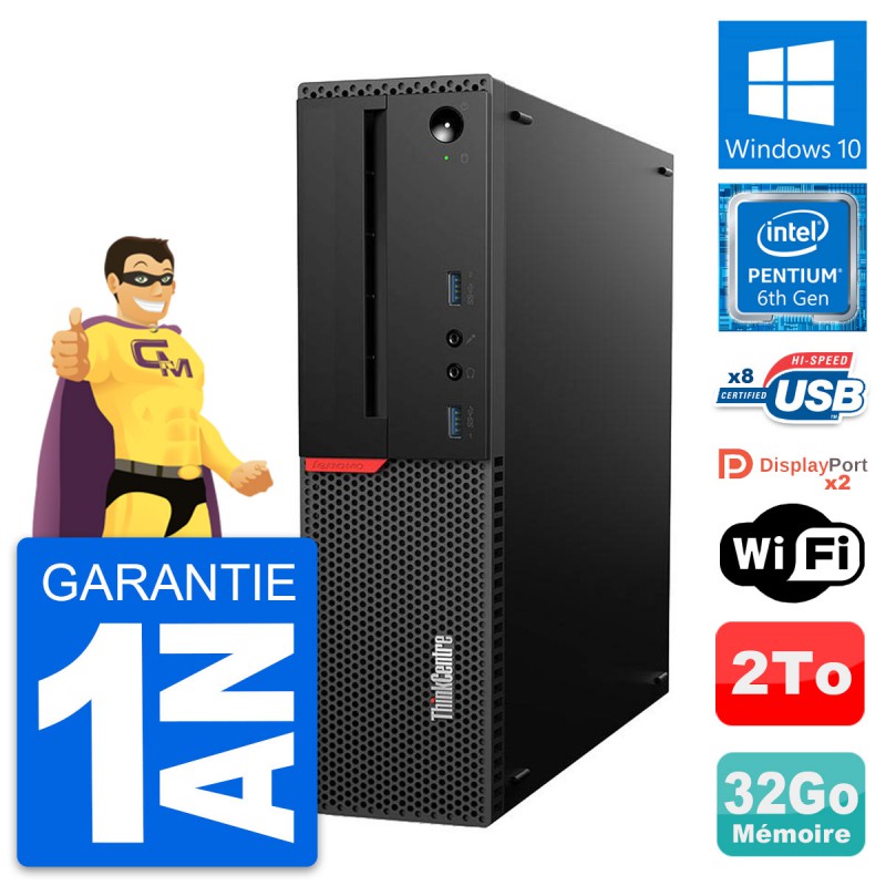 PC Lenovo ThinkCentre M800 SFF - Intel Pentium Dual-Core G4400 3.3 Ghz (3 Mo) - 32 Go DDR4 - Disque Dur 3,5" 2 To - Clef Wifi USB - Windows 10 - Garantie 1 an.