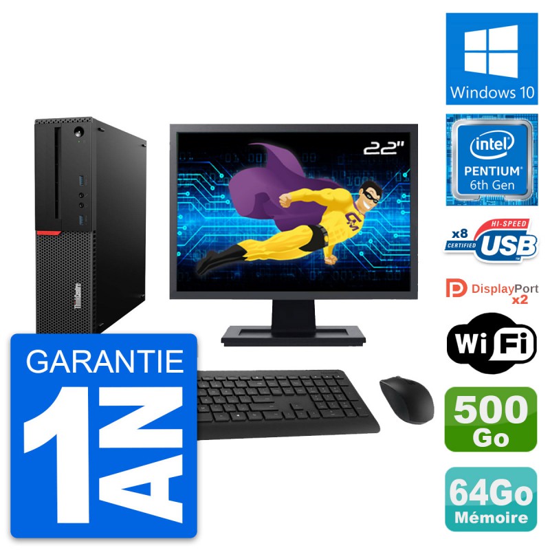 PC Lenovo ThinkCentre M800 SFF - Intel Pentium Dual-Core G4400 3.3 Ghz (3 Mo) - 64 Go DDR4 - Disque Dur 3,5" 500 Go - Clef Wifi USB - Windows 10 - Livré avec Ecran 22" + clavier + souris (Marques et modèles variables) - Garantie 1 an.