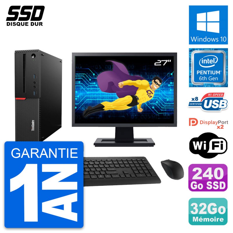 PC Lenovo ThinkCentre M800 SFF - Intel Pentium Dual-Core G4400 3.3 Ghz (3 Mo) - 32 Go DDR4 - SSD 240 Go - Clef Wifi USB - Windows 10 - Livré avec Ecran 27" + clavier + souris (Marques et modèles variables) - Garantie 1 an.