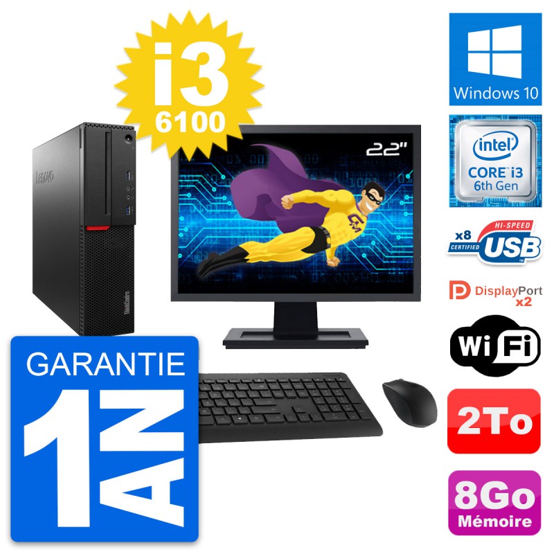 PC Lenovo ThinkCentre M800 SFF - Intel Core i3-6100 3.7 Ghz (3 Mo) - 8 Go DDR4 - Disque Dur 3,5" 2 To - Clef Wifi USB - Windows 10 - Livré avec Ecran 22" + clavier + souris (Marques et modèles variables) - Garantie 1 an.