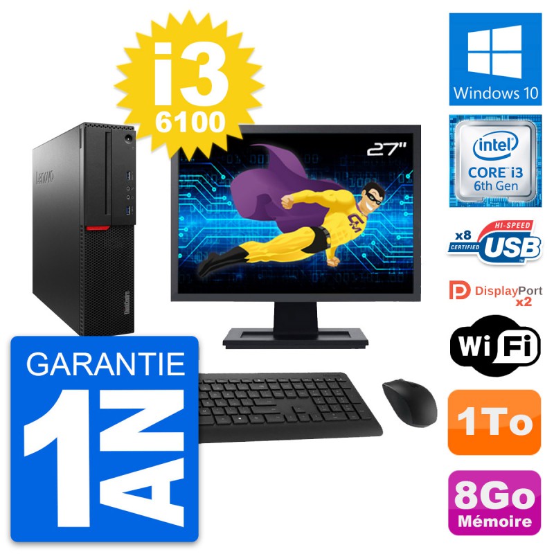 PC Lenovo ThinkCentre M800 SFF - Intel Core i3-6100 3.7 Ghz (3 Mo) - 8 Go DDR4 - Disque Dur 3,5" 1 To - Clef Wifi USB - Windows 10 - Livré avec Ecran 27" + clavier + souris (Marques et modèles variables) - Garantie 1 an.