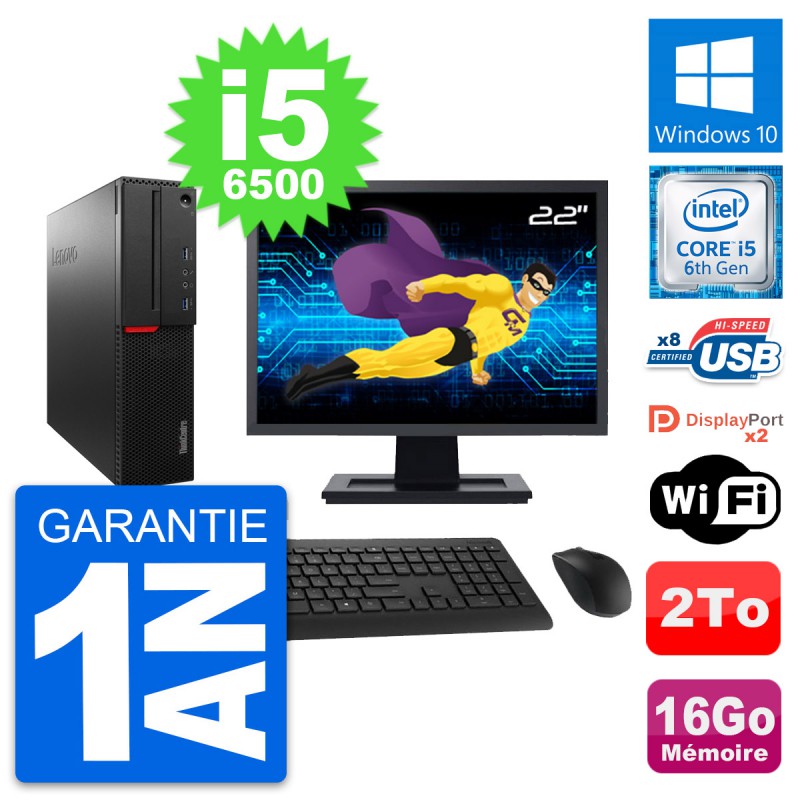 PC Lenovo ThinkCentre M800 SFF - Intel Core i5-6500 3.2 Ghz (6 Mo) - 16 Go DDR4 - Disque Dur 3,5" 2 To - Clef Wifi USB - Windows 10 - Livré avec Ecran 22" + clavier + souris (Marques et modèles variables) - Garantie 1 an.