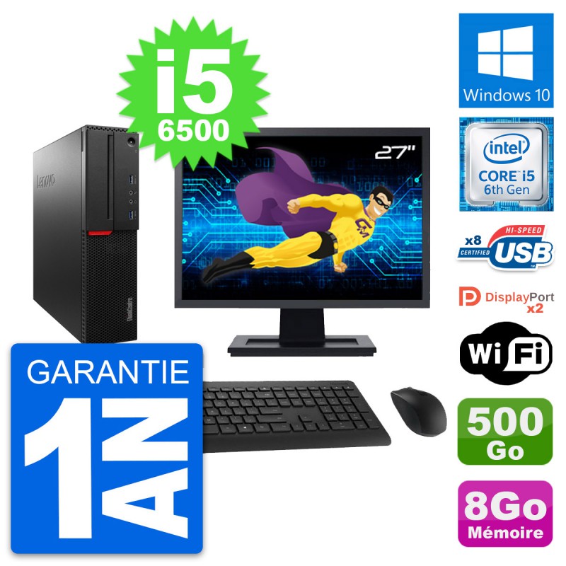 PC Lenovo ThinkCentre M800 SFF - Intel Core i5-6500 3.2 Ghz (6 Mo) - 8 Go DDR4 - Disque Dur 3,5" 500 Go - Clef Wifi USB - Windows 10 - Livré avec Ecran 27" + clavier + souris (Marques et modèles variables) - Garantie 1 an.