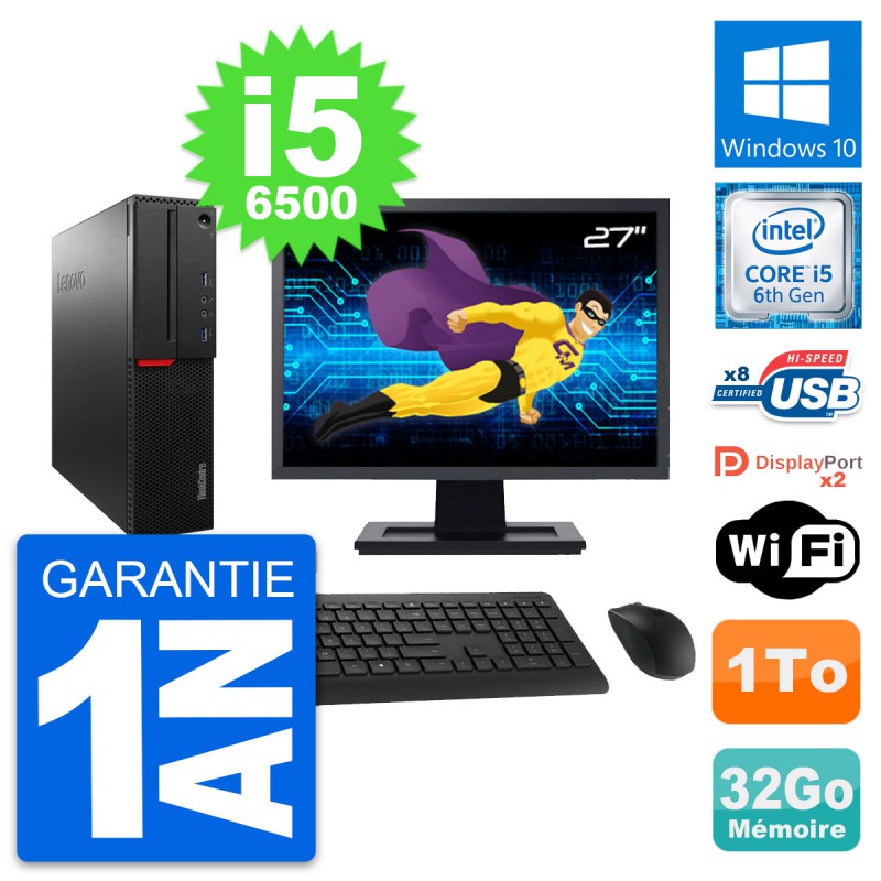 PC Lenovo ThinkCentre M800 SFF - Intel Core i5-6500 3.2 Ghz (6 Mo) - 32 Go DDR4 - Disque Dur 3,5" 1 To - Clef Wifi USB - Windows 10 - Livré avec Ecran 27" + clavier + souris (Marques et modèles variables) - Garantie 1 an.