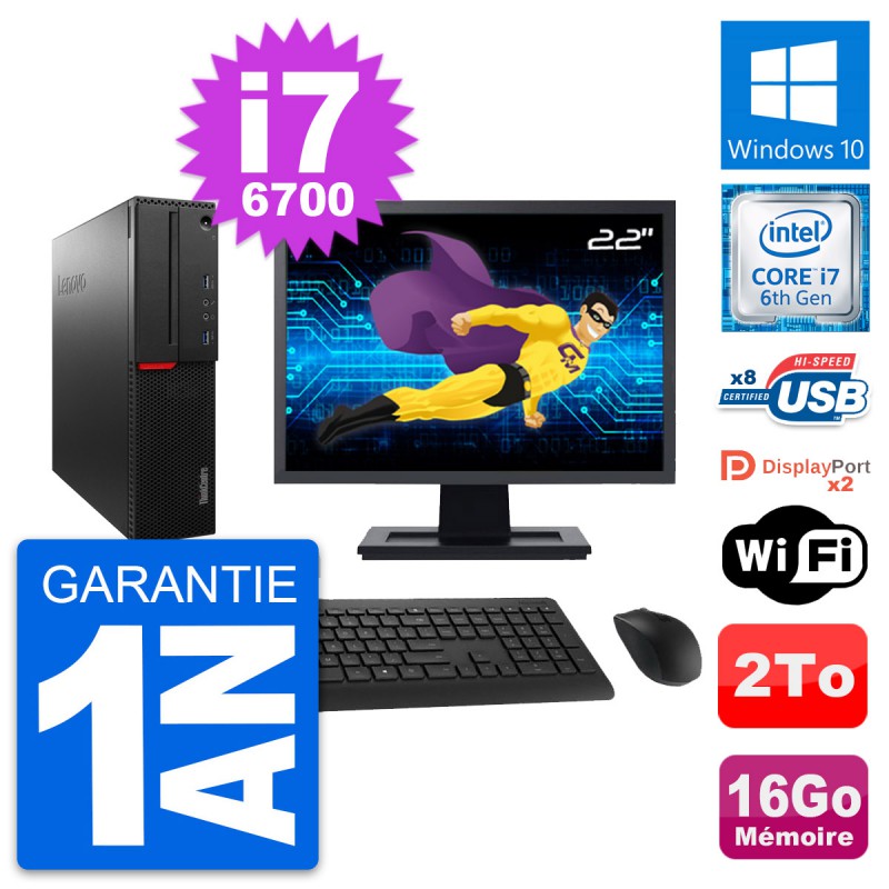 PC Lenovo ThinkCentre M800 SFF - Intel Core i7-6700 3.4 Ghz (8 Mo) - 16 Go DDR4 - Disque Dur 3,5" 2 To - Clef Wifi USB - Windows 10 - Livré avec Ecran 22" + clavier + souris (Marques et modèles variables) - Garantie 1 an.