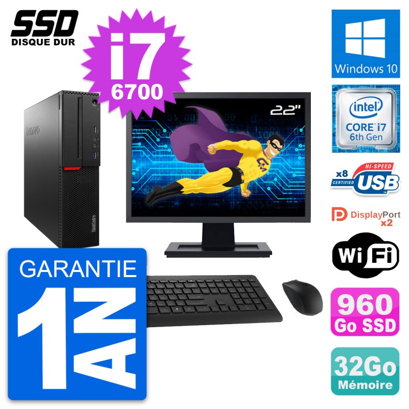 PC Lenovo ThinkCentre M800 SFF - Intel Core i7-6700 3.4 Ghz (8 Mo) - 32 Go DDR4 - SSD 960 Go - Clef Wifi USB - Windows 10 - Livré avec Ecran 22" + clavier + souris (Marques et modèles variables) - Garantie 1 an.
