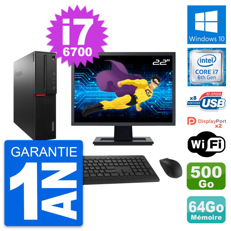 PC Lenovo ThinkCentre M800 SFF - Intel Core i7-6700 3.4 Ghz (8 Mo) - 64 Go DDR4 - Disque Dur 3,5" 500 Go - Clef Wifi USB - Windows 10 - Livré avec Ecran 22" + clavier + souris (Marques et modèles variables) - Garantie 1 an.