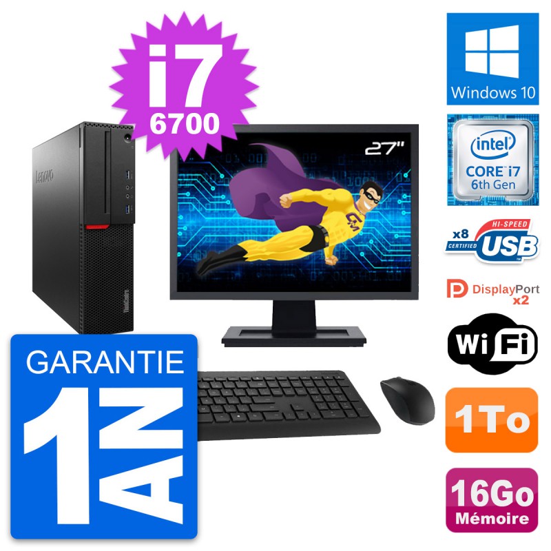 PC Lenovo ThinkCentre M800 SFF - Intel Core i7-6700 3.4 Ghz (8 Mo) - 16 Go DDR4 - Disque Dur 3,5" 1 To - Clef Wifi USB - Windows 10 - Livré avec Ecran 27" + clavier + souris (Marques et modèles variables) - Garantie 1 an.