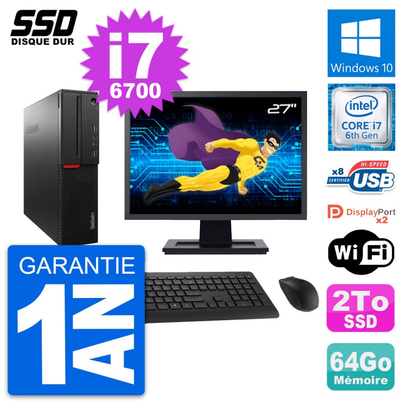 PC Lenovo ThinkCentre M800 SFF - Intel Core i7-6700 3.4 Ghz (8 Mo) - 64 Go DDR4 - SSD 2 To - Clef Wifi USB - Windows 10 - Livré avec Ecran 27" + clavier + souris (Marques et modèles variables) - Garantie 1 an.