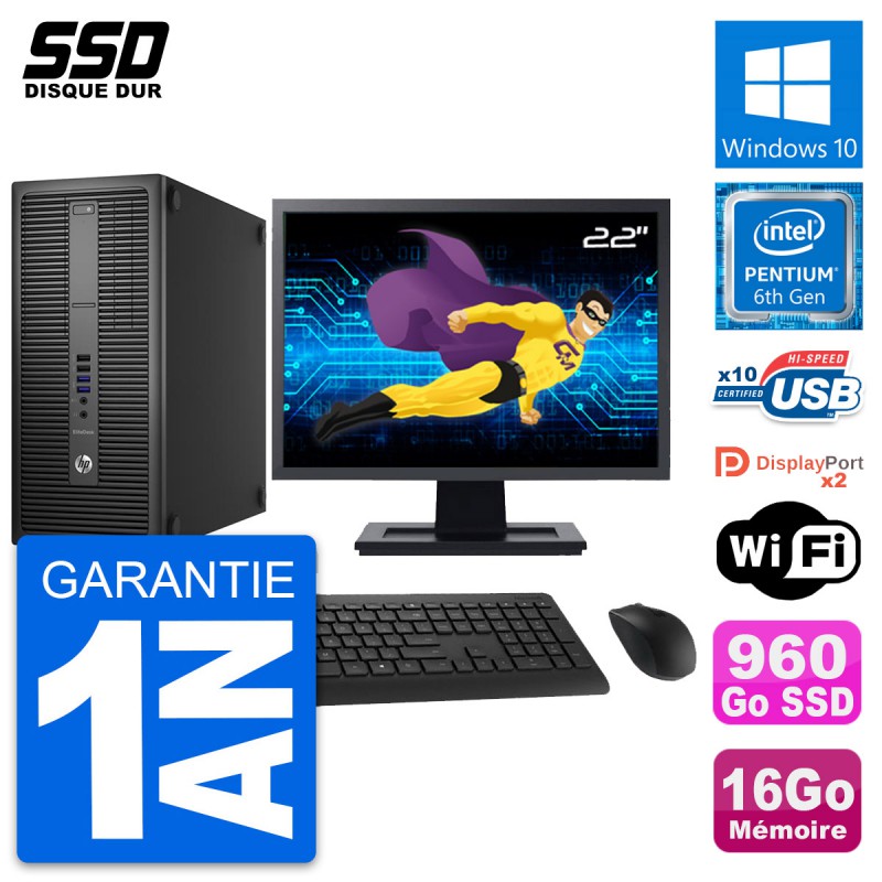 PC Tour HP EliteDesk 800 G2 - Intel Pentium Dual Core G4400 3.3 Ghz (3 Mo) - 16 Go DDR4 - Disque Dur SSD 960 Go - Clef Wifi USB - Windows 10 - Livré avec Ecran 22" + clavier + souris (Marques et modèles variables) - Garantie 1 an.