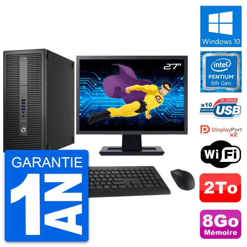 PC Tour HP EliteDesk 800 G2 - Intel Pentium Dual Core G4400 3.3 Ghz (3 Mo) - 8 Go DDR4 - Disque Dur 3,5" 2 To - Clef Wifi USB - Windows 10 - Livré avec Ecran 27" + clavier + souris (Marques et modèles variables) - Garantie 1 an.