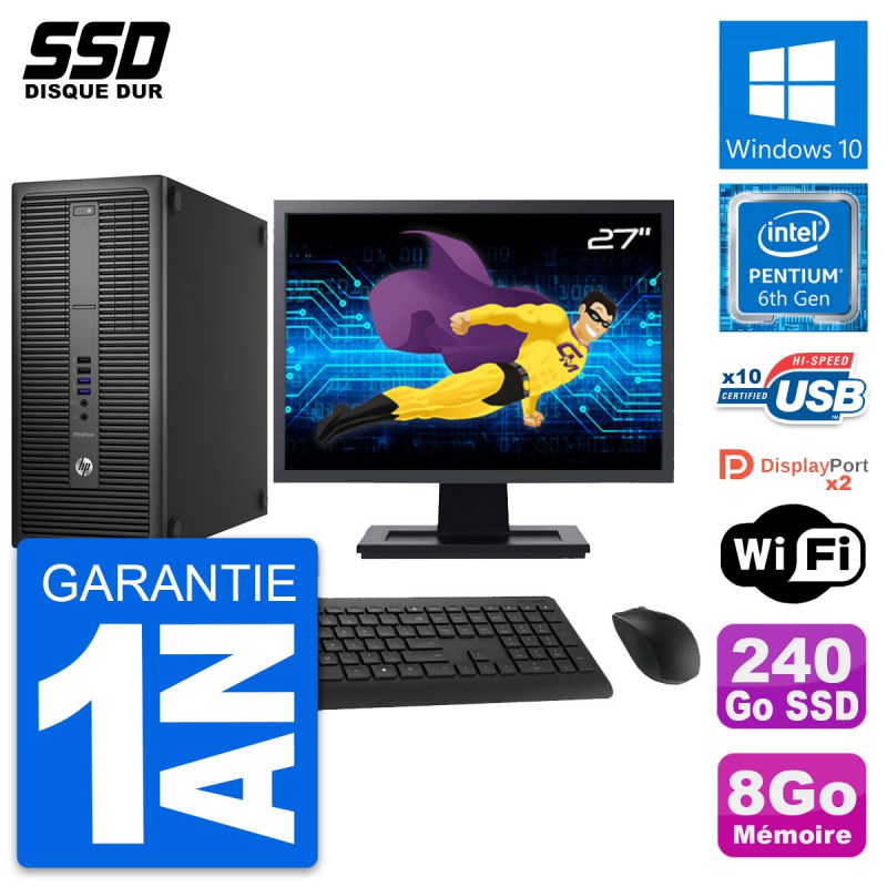 PC Tour HP EliteDesk 800 G2 - Intel Pentium Dual Core G4400 3.3 Ghz (3 Mo) - 8 Go DDR4 - Disque Dur SSD 240 Go - Clef Wifi USB - Windows 10 - Livré avec Ecran 27" + clavier + souris (Marques et modèles variables) - Garantie 1 an.