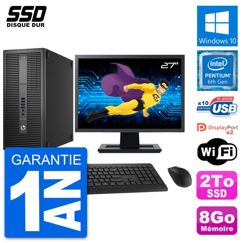 PC Tour HP EliteDesk 800 G2 - Intel Pentium Dual Core G4400 3.3 Ghz (3 Mo) - 8 Go DDR4 - Disque Dur SSD 2 To - Clef Wifi USB - Windows 10 - Livré avec Ecran 27" + clavier + souris (Marques et modèles variables) - Garantie 1 an.