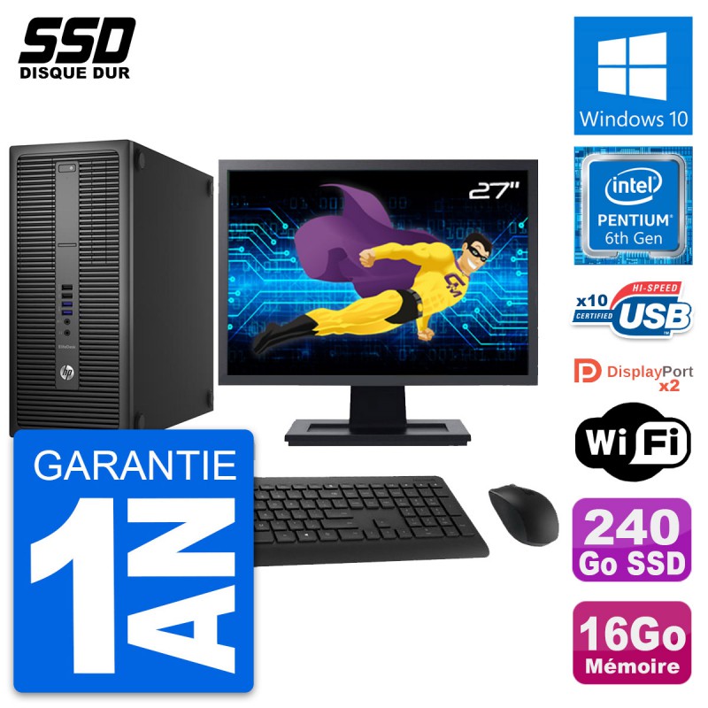 PC Tour HP EliteDesk 800 G2 - Intel Pentium Dual Core G4400 3.3 Ghz (3 Mo) - 16 Go DDR4 - Disque Dur SSD 240 Go - Clef Wifi USB - Windows 10 - Livré avec Ecran 27" + clavier + souris (Marques et modèles variables) - Garantie 1 an.