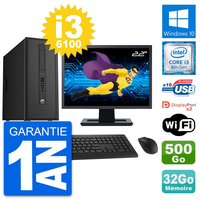 PC Tour HP EliteDesk 800 G2 - Intel Core i3-6100 3.7 Ghz (3 Mo) - 32 Go DDR4 - Disque Dur 3,5" 500 Go - Clef Wifi USB - Windows 10 - Livré avec Ecran 22" + clavier + souris (Marques et modèles variables) - Garantie 1 an.