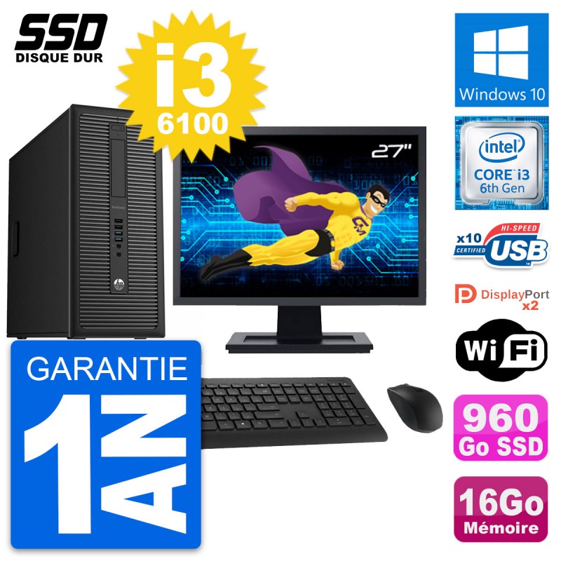 PC Tour HP EliteDesk 800 G2 - Intel Core i3-6100 3.7 Ghz (3 Mo) - 16 Go DDR4 - Disque Dur SSD 960 Go - Clef Wifi USB - Windows 10 - Livré avec Ecran 27" + clavier + souris (Marques et modèles variables) - Garantie 1 an.