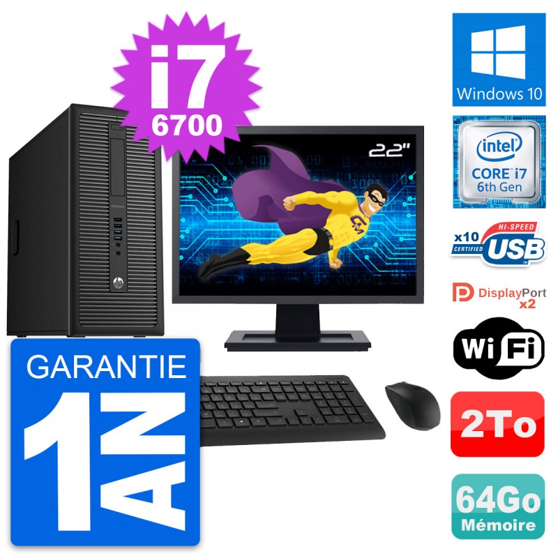 PC Tour HP EliteDesk 800 G2 - Intel Core i7-6700 3.4 Ghz (8 Mo) - 64 Go DDR4 - Disque Dur 3,5" 2 To - Clef Wifi USB - Windows 10 - Livré avec Ecran 22" + clavier + souris (Marques et modèles variables) - Garantie 1 an.