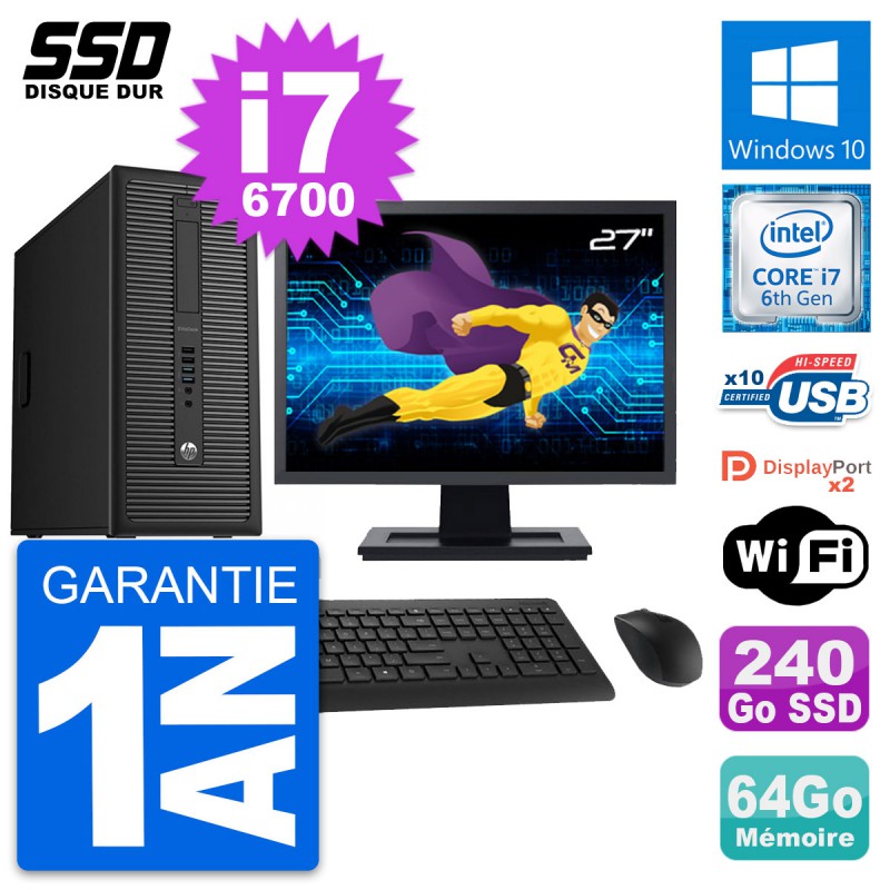 PC Tour HP EliteDesk 800 G2 - Intel Core i7-6700 3.4 Ghz (8 Mo) - 64 Go DDR4 - Disque Dur SSD 240 Go - Clef Wifi USB - Windows 10 - Livré avec Ecran 27" + clavier + souris (Marques et modèles variables) - Garantie 1 an.