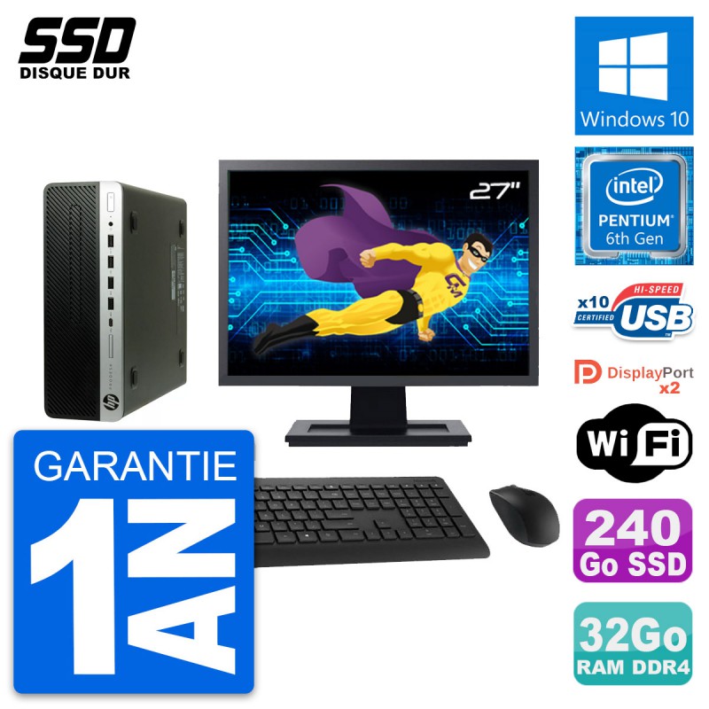 PC HP ProDesk 600 G3 SFF - Intel Pentium Dual-Core G4400 3.3 Ghz (3 Mo) - 32 Go DDR4 - SSD 240 Go - Clef Wifi USB - Windows 10 - Livré avec Ecran 27" + clavier + souris (Marques et modèles variables) - Garantie 1 an.