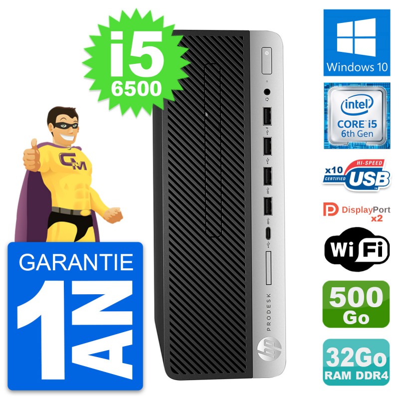 PC HP ProDesk 600 G3 SFF - Intel Core i5-6500 3.2 Ghz (6 Mo) - 32 Go DDR4 - Disque Dur 3,5" 500 Go - Clef Wifi USB - Windows 10 - Garantie 1 an.