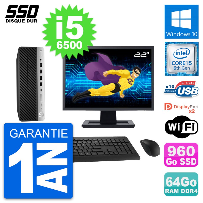 PC HP ProDesk 600 G3 SFF Ecran 22" i5-6500 RAM 64Go SSD 960Go Windows 10 Wifi