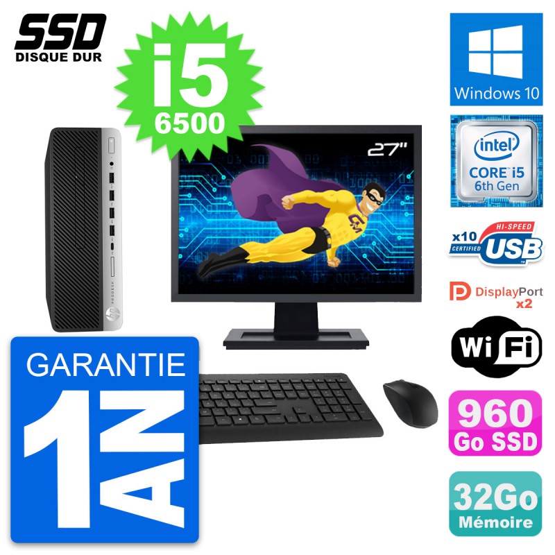 PC HP ProDesk 600 G3 SFF - Intel Core i5-6500 3.2 Ghz (6 Mo) - 32 Go DDR4 - SSD 960 Go - Clef Wifi USB - Windows 10 - Livré avec Ecran 27" + clavier + souris (Marques et modèles variables) - Garantie 1 an.